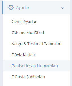 E-Ticaret siteniz üzerinden Havale / EFT ile ödeme kabul ediyorsanız, ödeme ekranında müşterilerinize ödeme yapabileceği banka hesap numaralarını göstermeniz gerekmektedir. Bu işlem için yönetici ekranından banka hesap numaraları tanımlamanız gereklidir. Banka hesap numarası eklemek için aşağıdaki adımları izleyiniz.