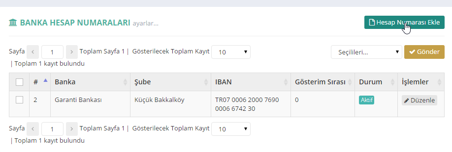 3- Karşınıza daha önce tanımlı olan banka hesaplarının listelendiği bir ekran gelecektir. Sağ üstte yer alan Hesap Numarası Ekle butonuna basınız.