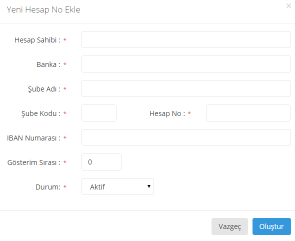 4- Banka Hesap numarası formu doldurularak yeni hesap numarası sisteme eklenmiş olur.