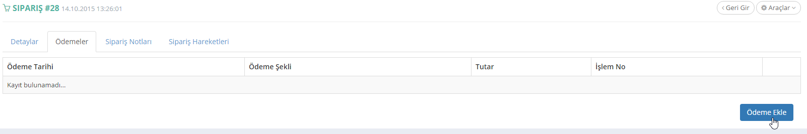 4- Sipariş detay sayfasının üst sekmesinden Ödemeler sekmesine tıklanır.