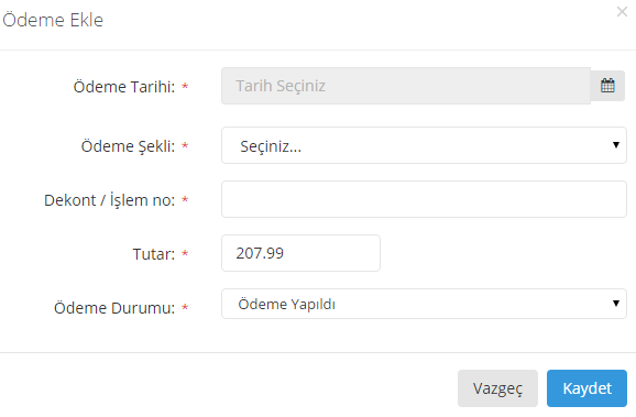 Bu ekrandan ödeme bilgileri girilerek Kaydet butonuna basılır.