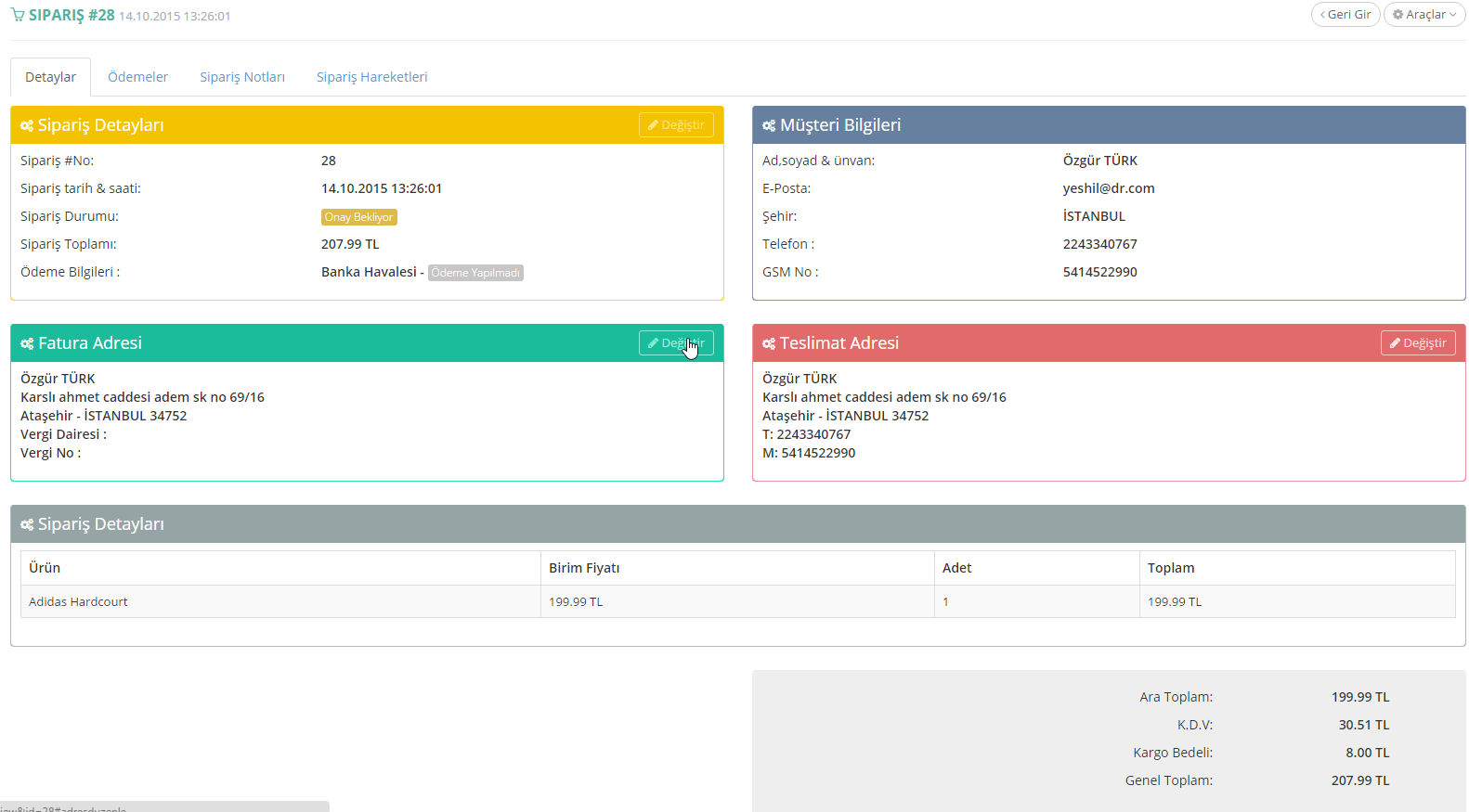 4- Karşınıza sipariş detay ekranı gelecektir. Bu ekranda yer alan Fatura Adresi gurubunun sağında yer alan "Değiştir" butonuna basılır.