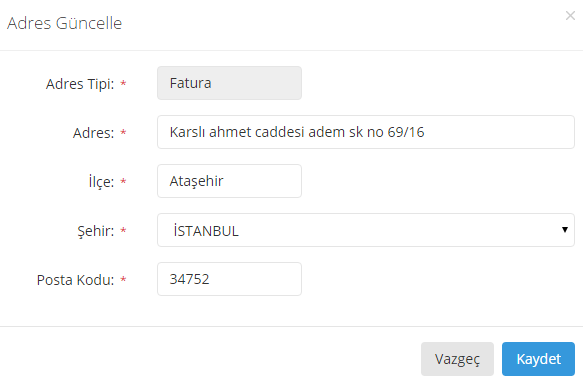 5- Karşınıza adres güncelleme ekranı gelecektir. Bu ekrandan yeni adres bilgileri girilerek Kaydet butonuna basılır.