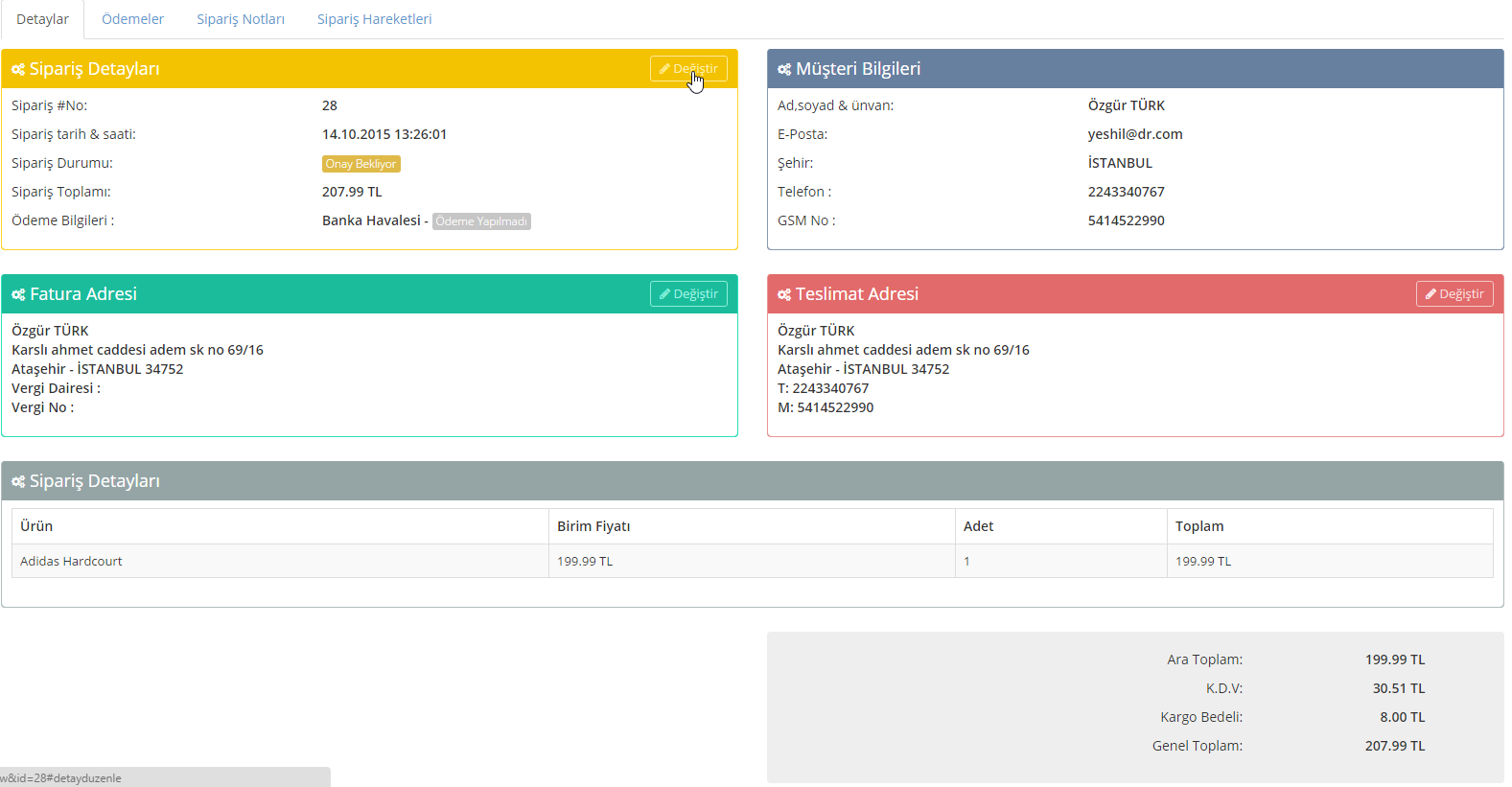 4- Karşınıza sipariş detay ekranı gelecektir. Bu ekranda Sipariş Detayları gurubunun sağ sütununda yer alan Değiştir butonuna basınız.