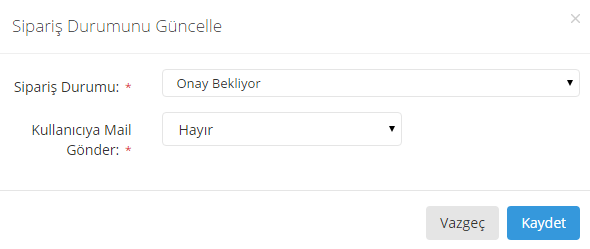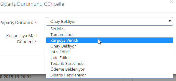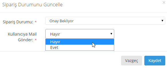 Kullanıcıya Mail Gönder : Bu alandan Kullanıcıya Mail Gönder seçeneği evet / hayır olarak seçilebilir. Müşterinize bu şekilde siparişin durumu ile ilgili otomatik olarak mail gönderilir.