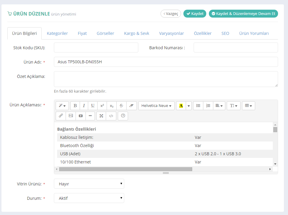 Ürün bilgileri alanında yer alan Vitrin Ürünü seçeneğini EVET olarak işaretleyip ayarları kayıt ediyoruz.