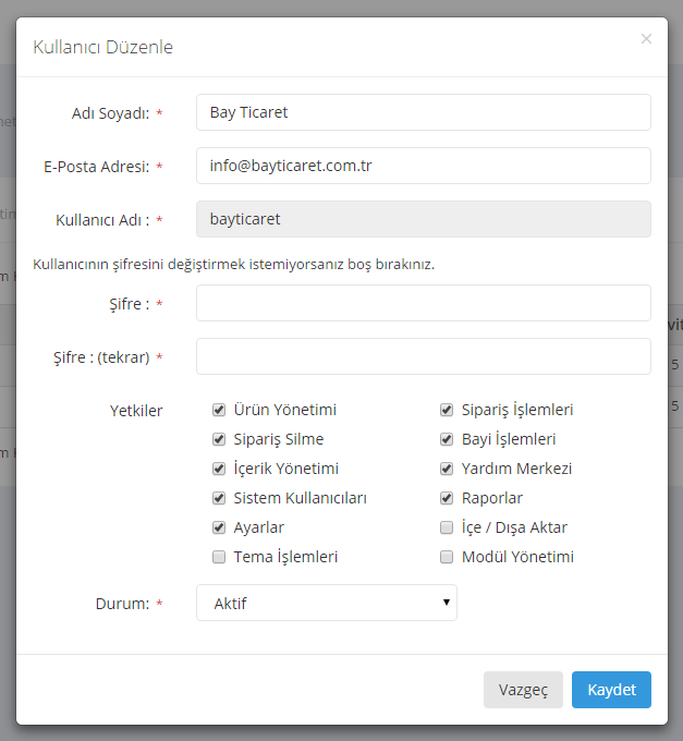 5- Bu ekranda yer alan "Yetkiler" bölümünden kullanıcının erişebileceği alanları kısıtlayabilirsiniz.