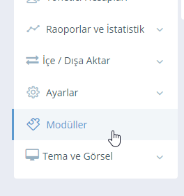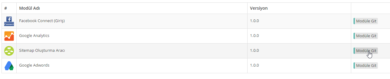 3 - Karşınıza aktif modüllerinizin yer aldığı liste gelecektir. Listenin içerisinden Sitemap Oluşturma Aracı modülü nün en sağında yer alan Modüle Git Butonuna basın.