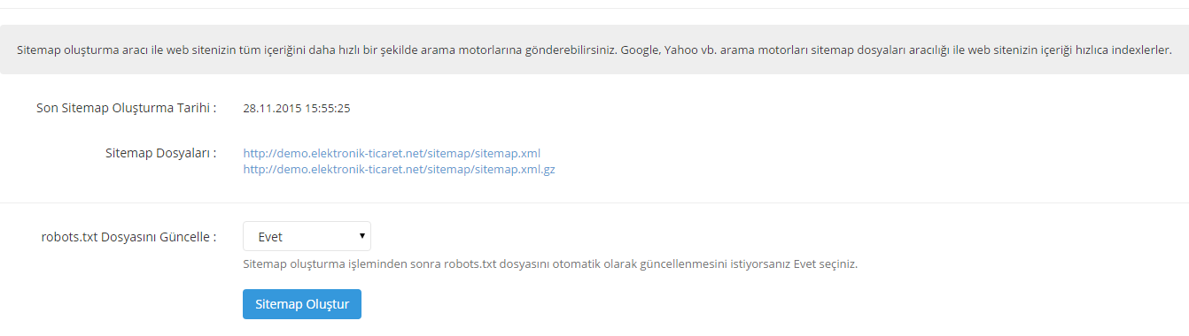 Sistem otomatik olarak sitemap dosyasını oluşturum arama motorlarına Ping gönderecektir. Aynı zamanda oluşturulan sitemap dosyalarınız için robots.txt dosyalasından link oluşturulmasını da sağlayabilirsiniz. Robots.txt dosyasını güncelle seçeneğini Evet olarak işaretleyerek sitemap oluşturmanız durumunda robots.txt dosyanızdan sitemap dosyalarınıza link oluşturulacaktır.