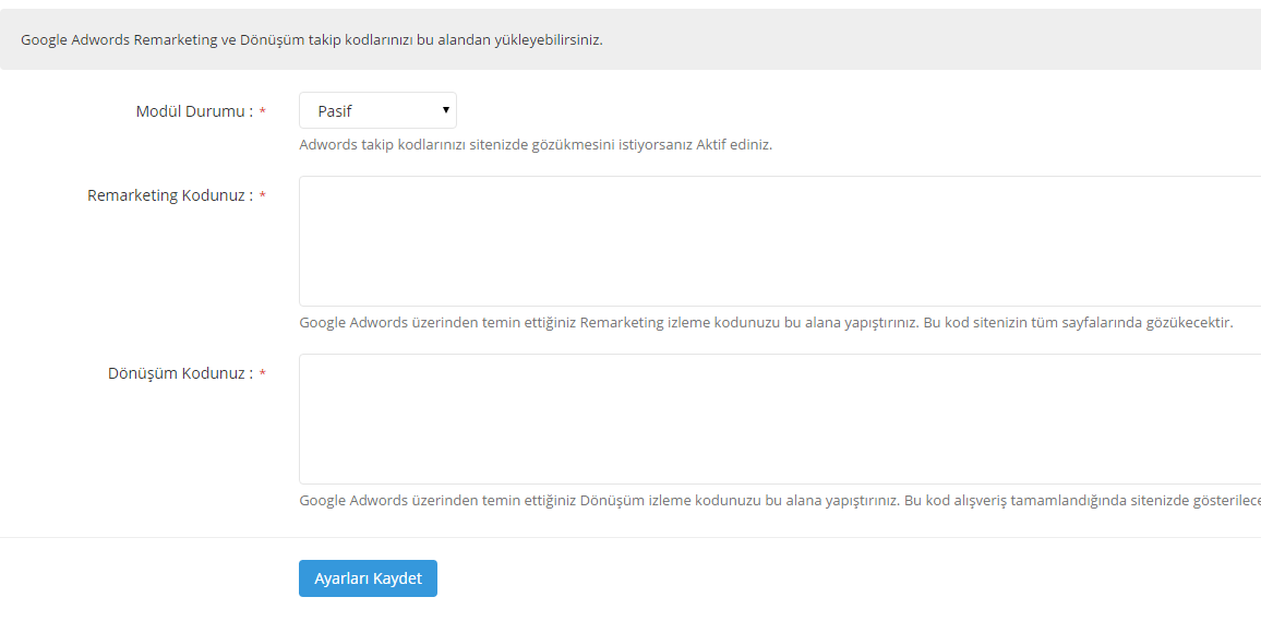 b : Adwords hesabınız üzerinden temin ettiğiniz Dönüşüm izleme kodunu Dönüşüm Kodunuz alanına yapıştırıp "Ayarları Kaydet" butonuna basınız.