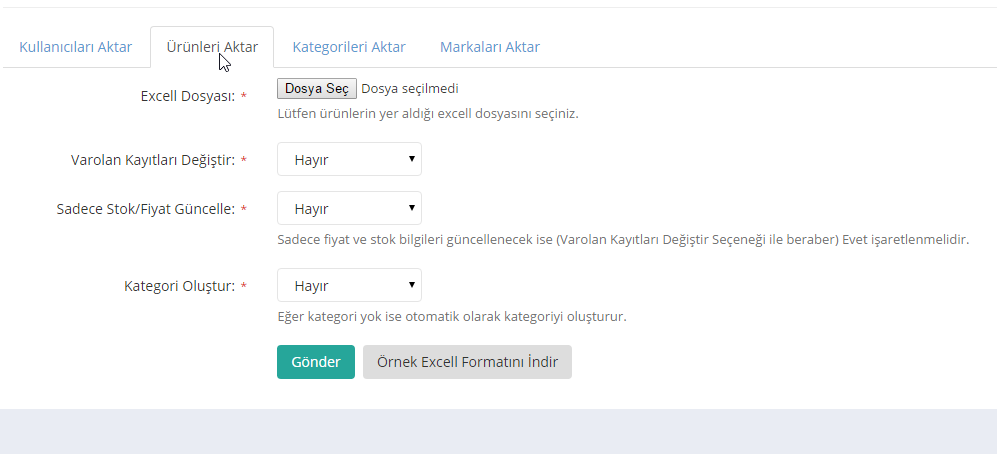 Kategori Oluştur : Hayır seçilir ise varolmayan kategori oluşturulmaz ve hatalı kayıt eklenmesine sebep olabilir. Evet seçmeniz önerilmektedir.