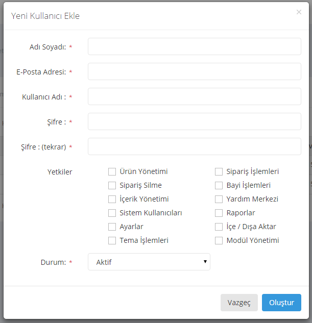 5- Kullanıcı tanımlamalarını yapıp, kullanıcının erişebileceği alanları setikten sonra "Oluştur" butonuna basınız.