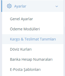 2- Sol menüden Ayarlar > Kargo Teslimat Tanımları linkine tıkalyın.