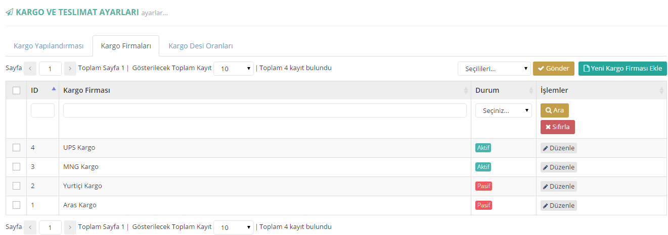 4- Bu ekranda sisteminizde tanımlı olan kargo firmaları listelenecektir. İşlem yapmak istediğiniz kargo firmasının sağ sütununda bulunan Düzenle butonuna basabilir veya Yeni Kargo Firması Ekle butonuna basrak kargo firması düzenleme formu açılır.
