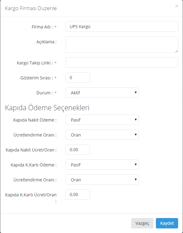 Kapıda Nakit Ödeme Seçeneği Aktif olarak işaretlenir, Kapıda ödeme hizmet bedelinin kargo tutarına yüzdelik bir oran ile eklenmesini isterseniz Ücretlendirme Oranı seçeneğinden Oran seçilir. Kapıda Nakit Ücret/Oran alanına yüzdelik oran veya sabit tutar girilir.