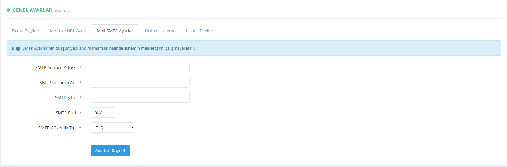 3- Karşınıza ayar sekmeleri gelecektir. Üst sekmeden Mail SMTP Ayarları seçeneğine tıklayınız.