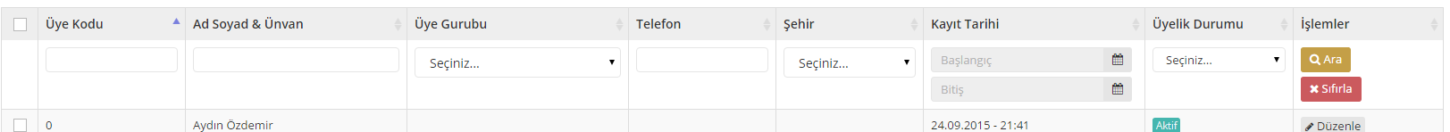 3- Karşınıza üyelerin listelendiği ekran gelecektir. Liste üstünde yer alan filtreleme alanından Ad Soyad, Tarih ve üye durumuna göre arama yapabilirsiniz.