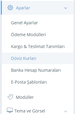 E-Ticaret siteniz içinde bulunan ürünler sipariş sırasında ayarladığınız kur üzerinden Türk Lirası cinsine çevirilerek sipariş tamamlanır. Bu kurları yönetici ekranından ayarlayabilir, periyodik olarak TCMB üzerinden güncellenmesini sağlayabilirsiniz. Bu ayarlama için aşağıdaki adımları izleyiniz.