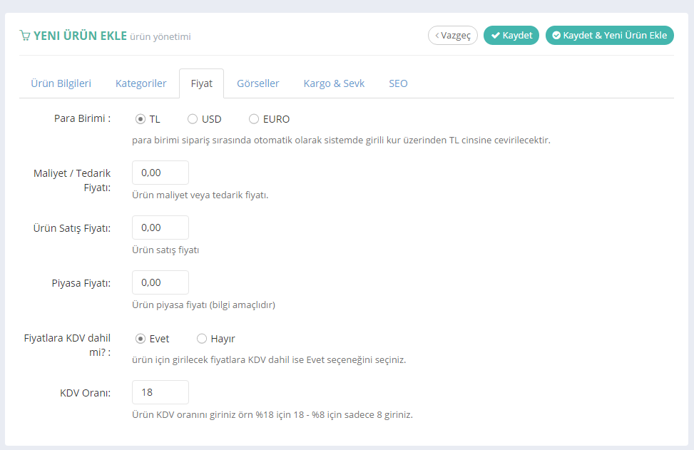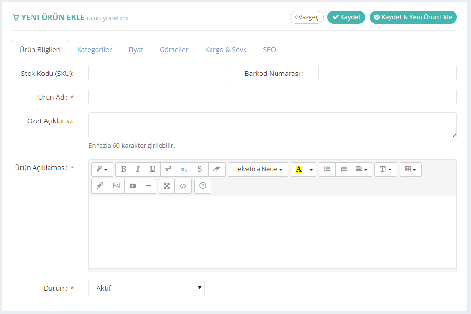 4 - Ürün ekleme formu aşağıdaki gibi karşınıza gelecektir. Sırasıyla tüm alanlar hakkında bilgi vermeye çalışacağız :