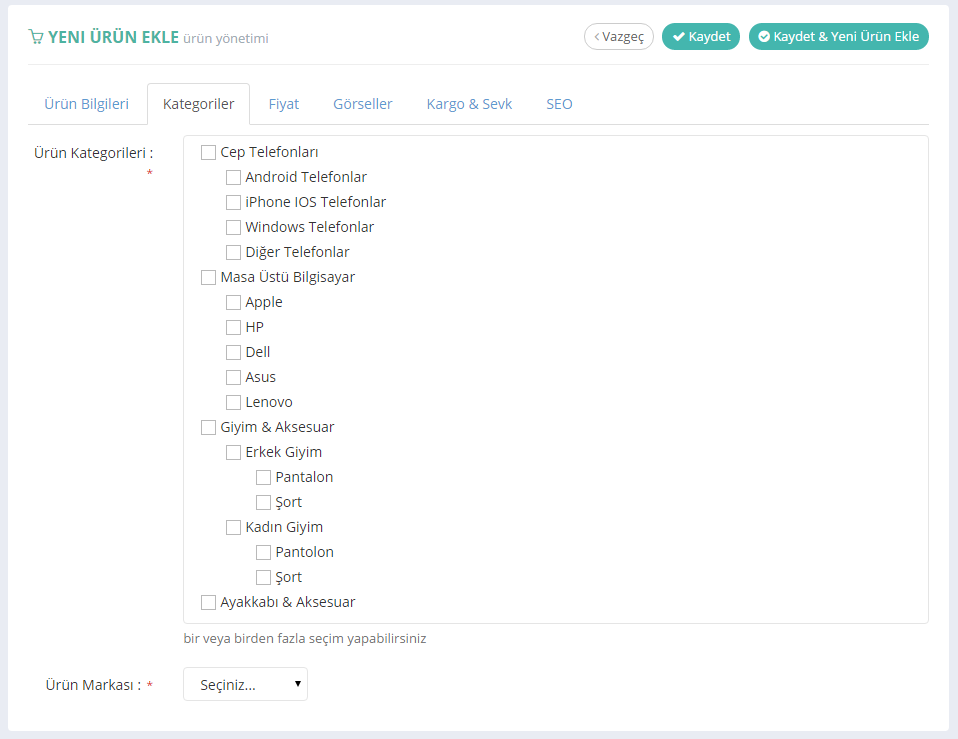 a- Ürün Kategorileri : Ürün kategori seçimi bu ekrandan yapılır. Birden fazla kategori seçebilirsiniz. (daha önce kategori oluşturmuş olmalısınız)