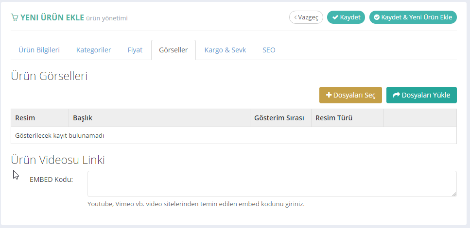 7- Ürün Görselleri ve Ürün Videosu Ekleme Alanı