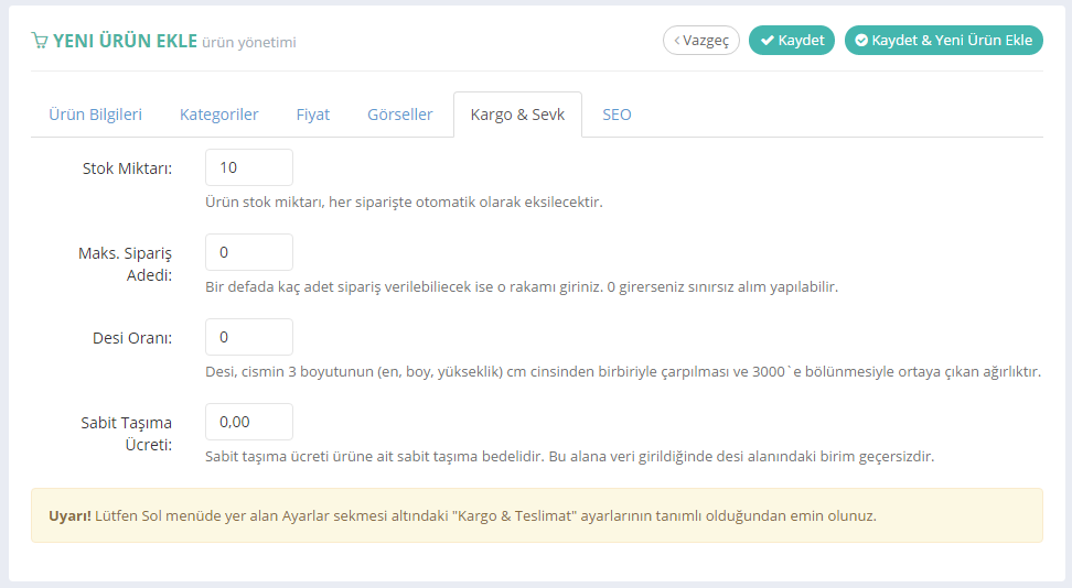 d- Sabit Taşıma Ücreti : Ürüne ait kargo bedeli sabit ise bu alandan belirlenebilir. (Kargo ayarlarını inceleyiniz)