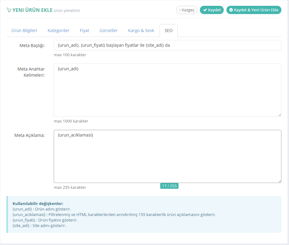 Ürüne ait özel seo etiketleri belirlemek istiyorsanız bu alandan bu bilgileri girebilirsiniz.