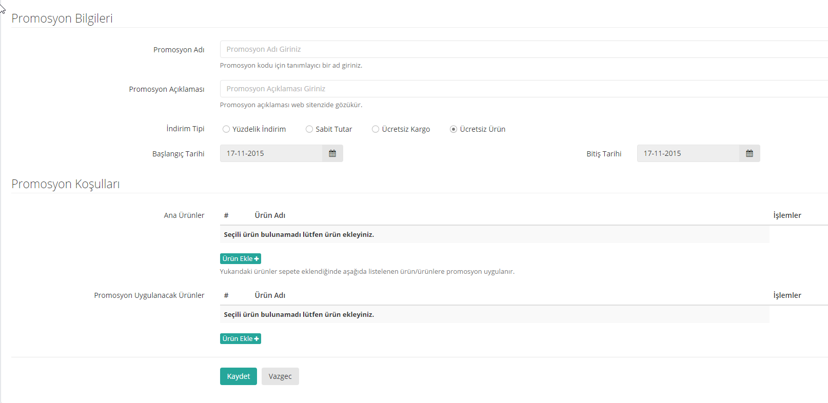 Tüm alanlar doldurulduktan sonra kaydet butonuna basılarak promosyon sisteme tanımlanır.